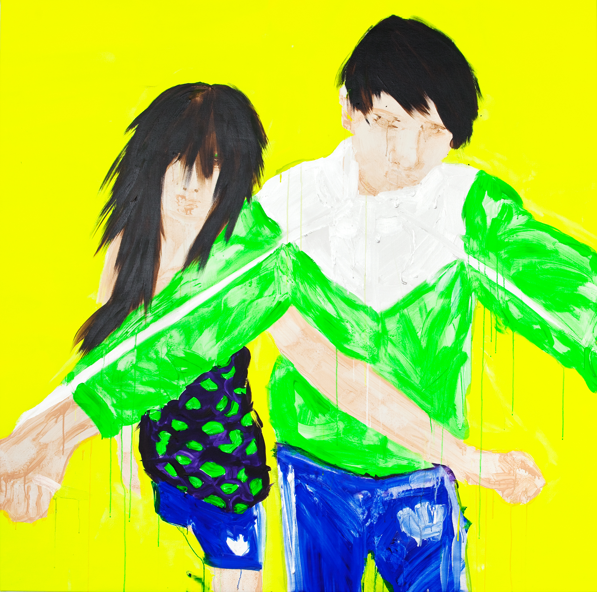 Rauha Mäkilä is known for her brightly coloured paintings depicting everyday occurrences, drawing from both popular culture and the artist’s own life and family. Her works, often featuring children, reveal the profound sincerity of their subjects, and an unreserved glorification of the joy of being young. Recently, Mäkilä has reflected on her own position and work as an artist. Her hectic neon world has occasionally shifted towards earthier tones, revealing the more sombre mysticism of youth, the silent strength, and the vacillation between different roles. Her most recent works ponder the state of the world through her characteristic imagery. She responds to the pitilessness of today’s world with art, and to cruelty with beauty.